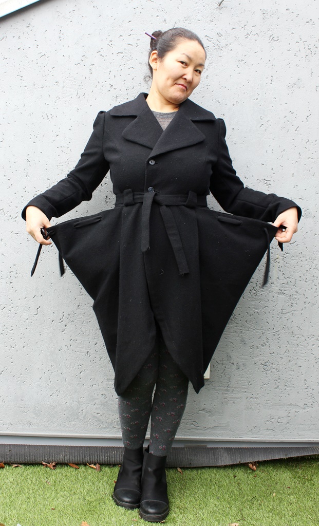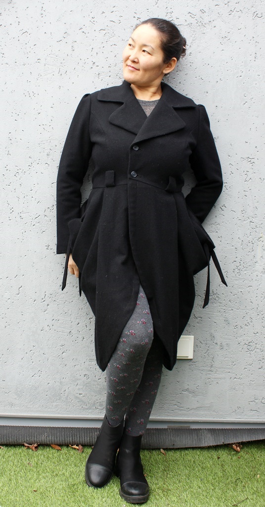 Oki trägt den Mantel in Größe 42, für folgende KörperMaße: Körpergröße 164cm, Brustumfang 98cm, Taillenumfang 84cm, Hüftumfang 103cm